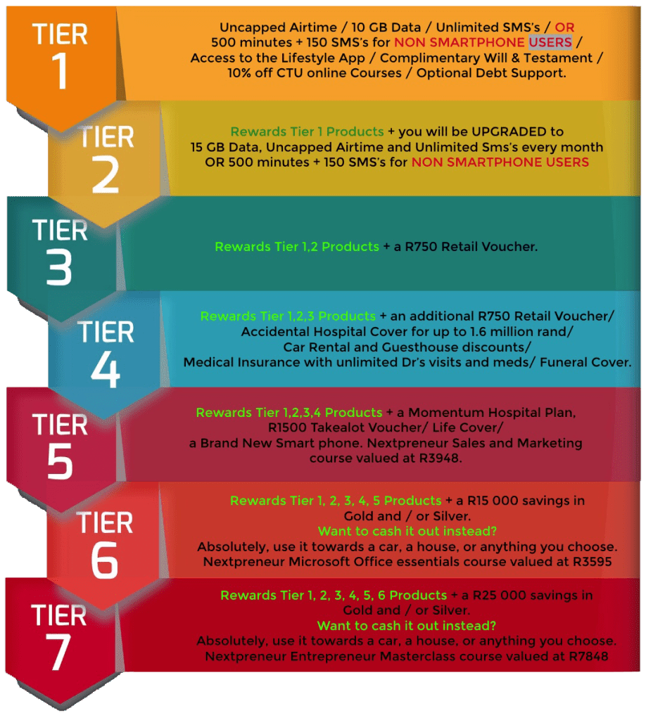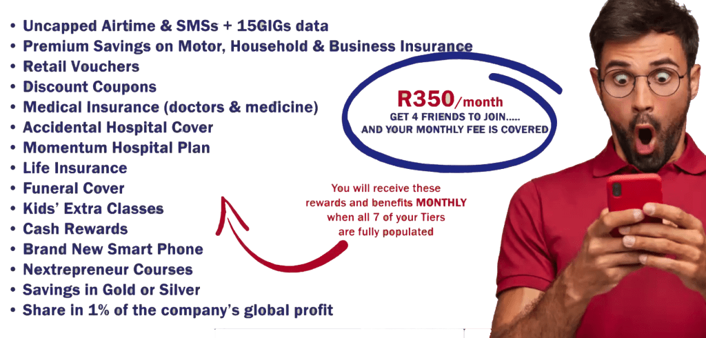 As you invite others, you unlock tier rewards — from uncapped airtime and retail vouchers to life cover and even savings in gold or silver that you can cash out toward a house or car.